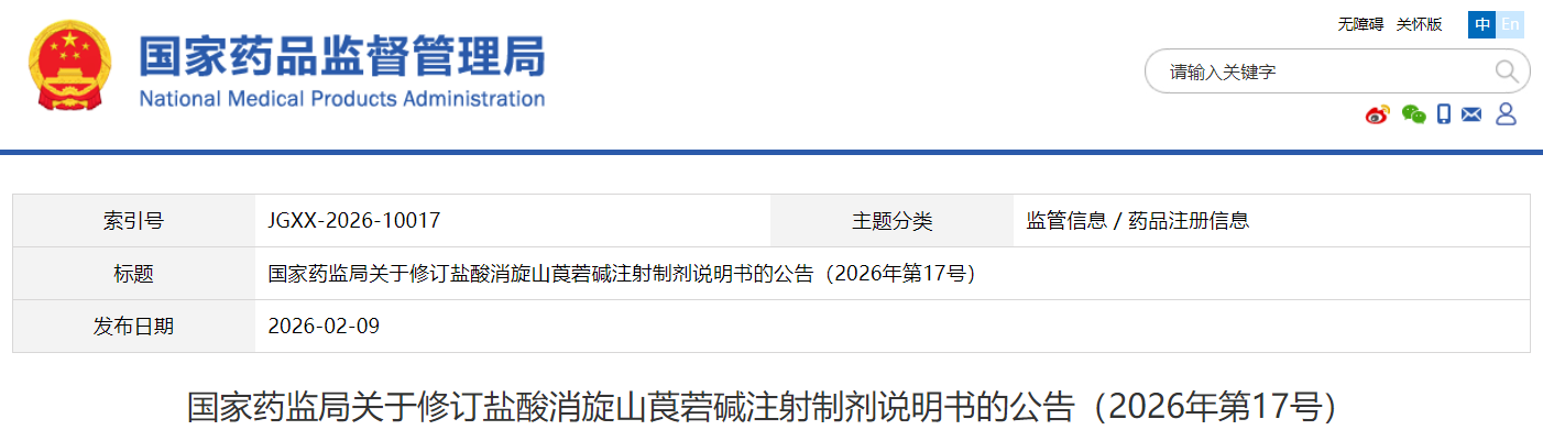 根据药品不良反应评估结果,为进一步保障公众用药安全,国家药监局决定对盐酸消旋山莨菪碱注射制剂(包括盐酸消旋山莨菪碱注射液、盐酸消旋山莨菪碱氯化钠注射液)说明书内容进行统一修订。现将有关事项公告如下: