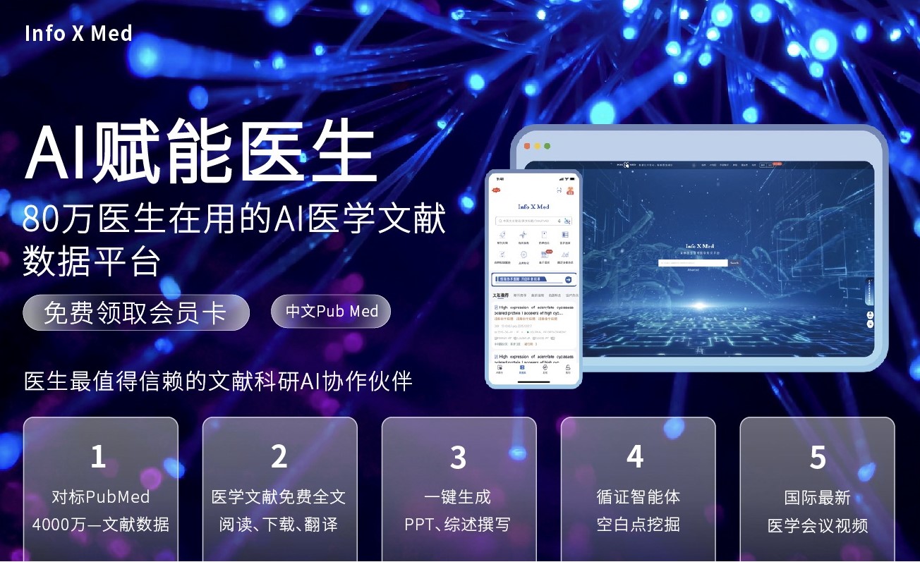 A:Info X Med不仅可以搜索医学文献,还是智能体,拥有强大的AI功能,在线阅读原文、下载、分享。可智能一键翻译、解读、生成PPT。空白点挖掘、靶点分析、综述撰写、省/国自然基金查询,增加系统评价、Meta分析、循证库等。使用自然语义进行交互,提供权威的临床决策。120万医学和规培医学题库。