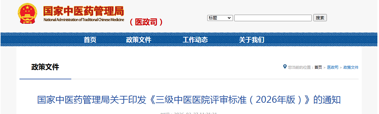 为引导强化中医医院坚持公益性、履行功能定位,全面落实“强基、稳二、控三”工作部署和分级诊疗制度要求,优化完善中医医院评审制度,保障医疗质量安全,提升医疗服务能力、医院管理水平和精细化运营效能,国家中医药管理局组织制定了《三级中医医院评审标准(2026年版)》。现印发给你们,请遵照执行。