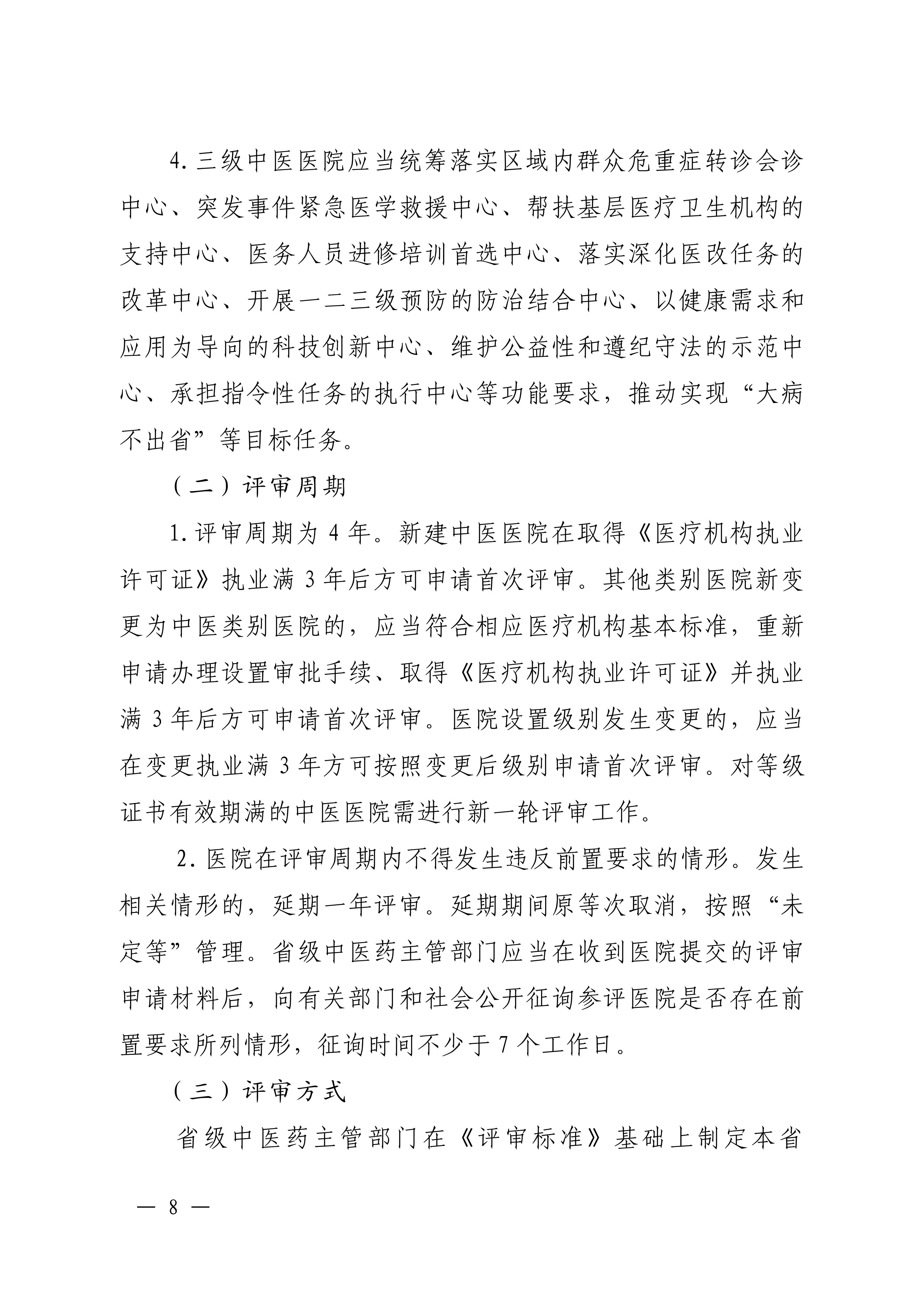 三是严格评审准入,落实“控三、稳二”要求。严格评审管理,规范评审程序,严守评审纪律,严把评审准入关,明确三级公立中医医院原则上应当由省级、地(市)级政府举办;少数人口基数大、群众中医药服务需求高的县(市),可以由县(市)级政府或与地(市)级政府共同举办三级公立中医医院。