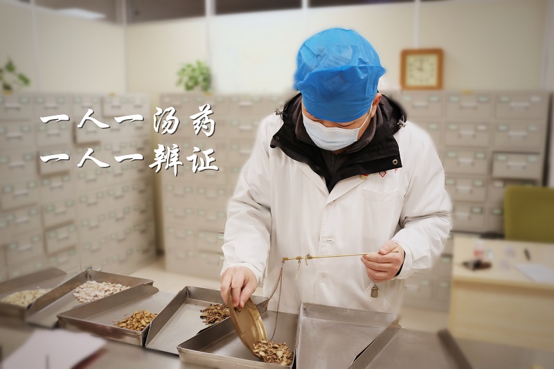 副主任药师汪全斌在为患者及医务人员调配中药