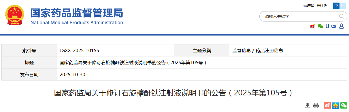 根据药品不良反应评估结果,为进一步保障公众用药安全,国家药监局决定对右旋糖酐铁注射液说明书内容进行统一修订。现将有关事项公告如下:
